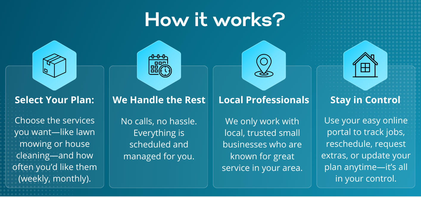 We’re not here to waste your Saturday.We built this for busy homeowners who want their home looked after—without babysitting contractors or cleaning on weekends.Trusted locals. One simple plan. All handled for you.It’s not just easier.